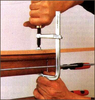 6. Затем широкой струбциной прижимают раму сиденья к обвязке и затягивают поперечные тиски до тех пор пока клей не выступит из швов. Излишки клея тотчас стереть.