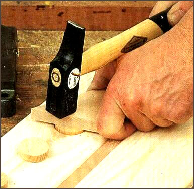 Некоторые считают, что глазки от сучьев украшают деревянные панели. Действительно, если это «здоровые» узлы, деревянная доска выглядит привлекательно, но если речь идет о ссохшихся, черных, а иногда и вывалившихся глазках, то это не только портит впечатление от деревянной поверхности, но и затрудняет обработку доски при распиловке, строгании и т. д. В таком случае глазки надо заделать. Дрелью со специальным сверлом (в наборе сверл должно быть и сверло для высверливания крупных отверстий) высверливается «больной» глазок. Диаметр отверстия должен быть на 10 мм больше диаметра вкладыша. Отверстие заполняется клеевой массой, и вкладыш загоняется в отверстие молотком. Вкладыши имеют стандартные размеры, соответствующие размеру сверла (причем для продольных и поперечных срезов - различные). При необходимости можно и самому напилить такие вкладыши — из сучка соответствующей толщины.